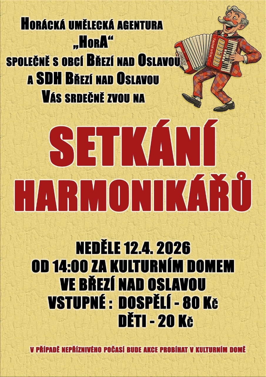 Pozvánka na Setkání Harmonikářů do Březí nad Oslavou v neděli 12.4.2026